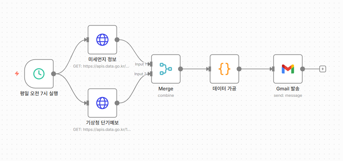 바쁜 출근길, 미세먼지 수치를 확인하려다 지각할 뻔한 적 없으신가요? 오늘은 n8n 날씨 자동화 설정을 통해 매일 아침 공공데이터 API 정보를 이메일로 받는 법을 알아보겠습니다. NAS 환경이나 로컬 PC 어디서든 간단하게 구축할 수 있습니다. 1. n8n 워크플로우 전체 구조 워크플로우는 크게 트리거 – 데이터 수집 – 병합 – 가공 – 전송의 5단계로 구성됩니다. 2. 공공데이터포털 API … 더 읽기